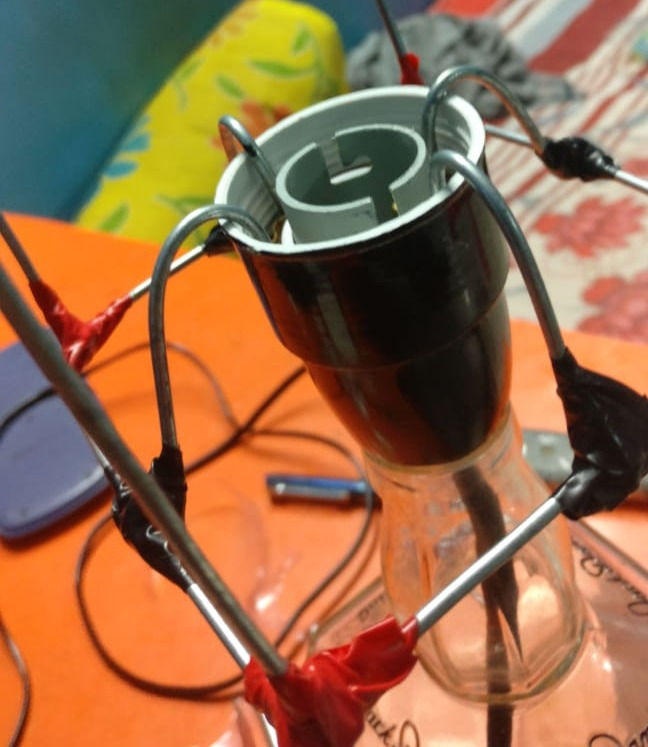 How to attach the bulb holder to the bottle? was actually the trickiest part that they had faced during the project and solution is quite interesting. The team while buying the Stainless Steel wire which was used to make the frame for the lampshade stumbled upon a drain pipe socket and coincidently it was a perfect fit on the bottle and also securely kept the holder in place.